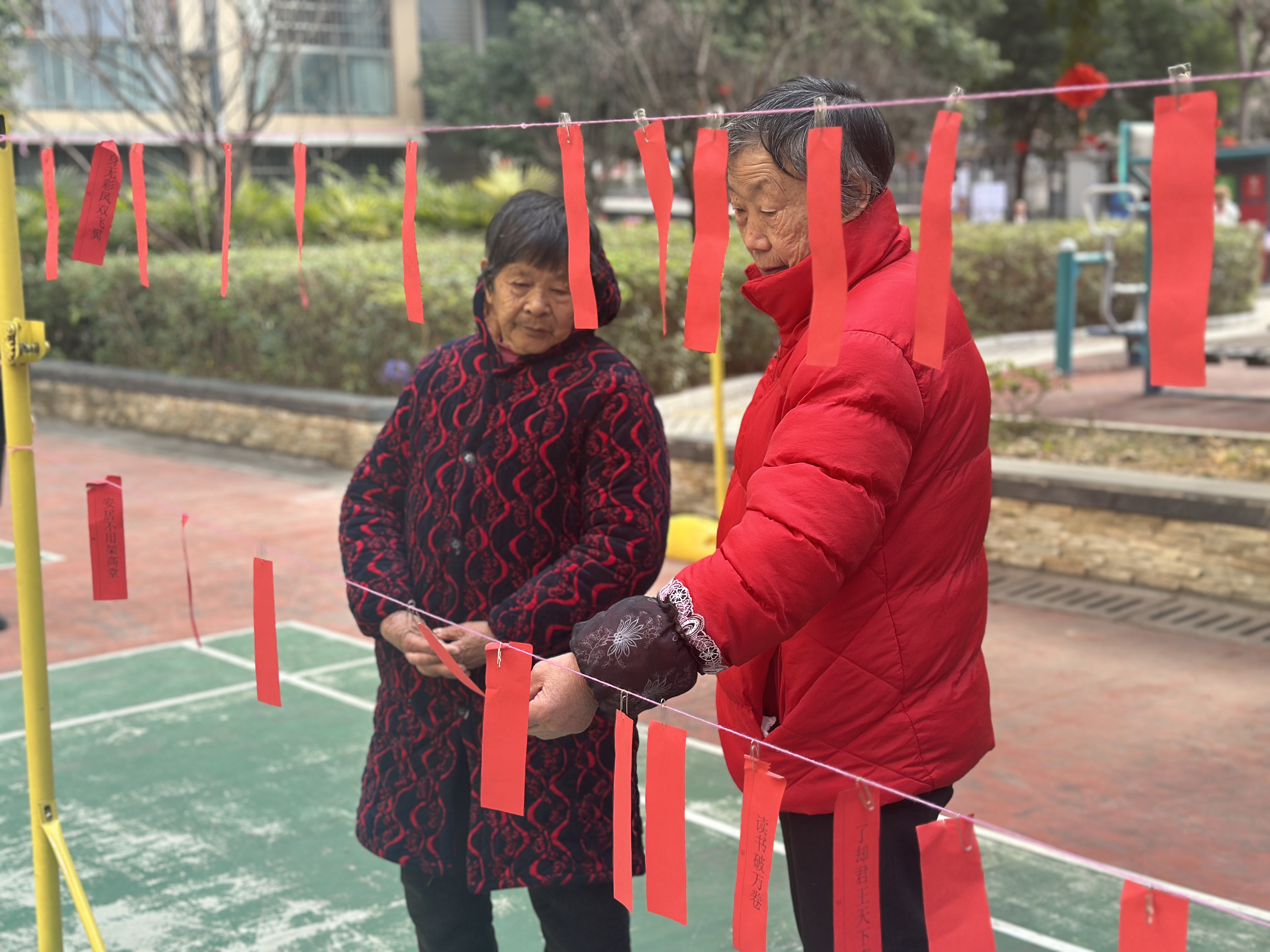 古诗词对句区尽显文化韵味,工作人员准备了贴合新春与马年主题的诗词名句,住户们踊跃参与、各展才华,在互动中感受中华诗词魅力,现场欢声笑语不断。